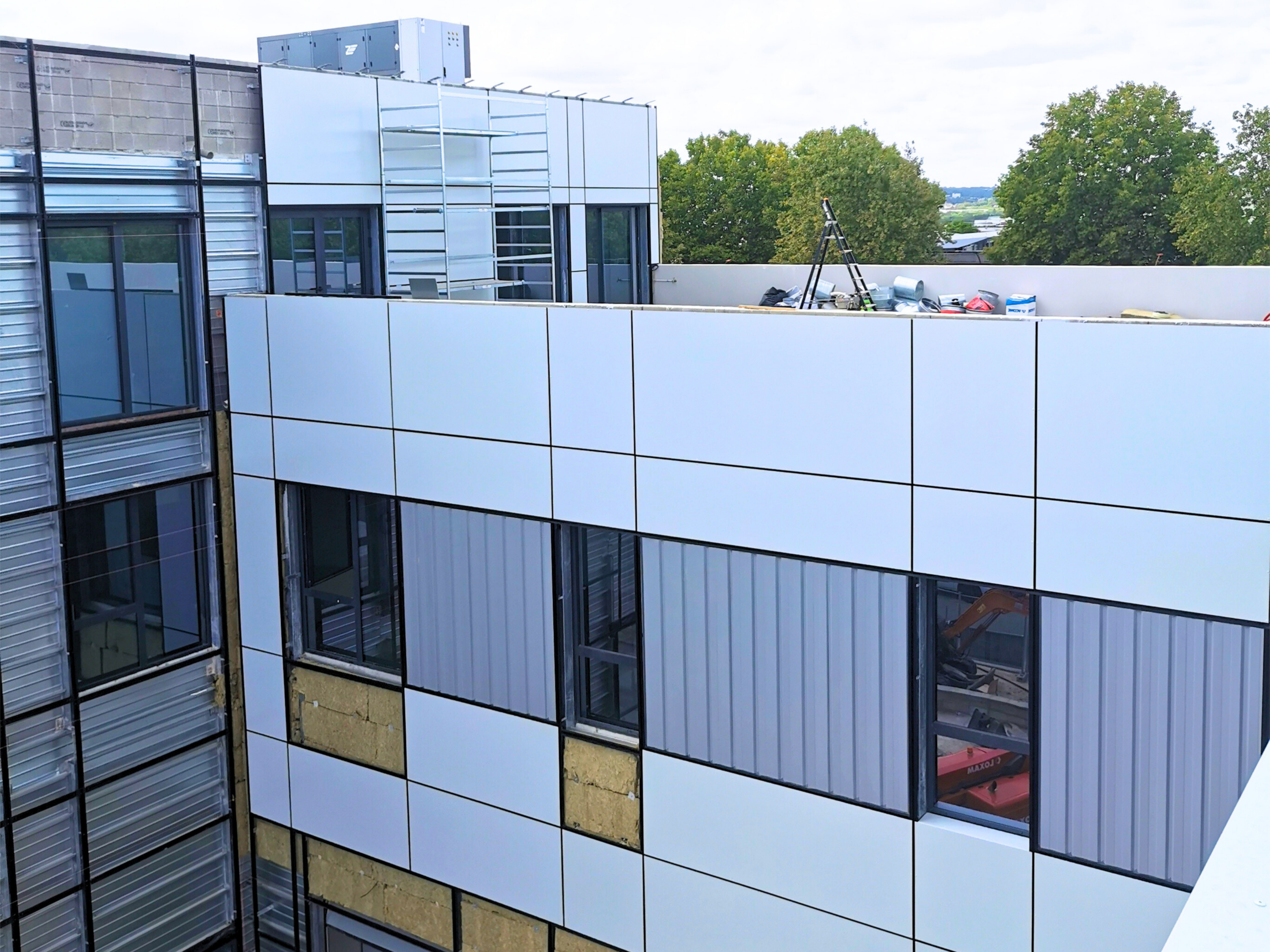En atelier, la fabrication sur mesure a mobilisé l’ensemble de nos compétences en métallerie et serrurerie industrielle : préparation des structures, intégration de l’isolation et pose des habillages métalliques.