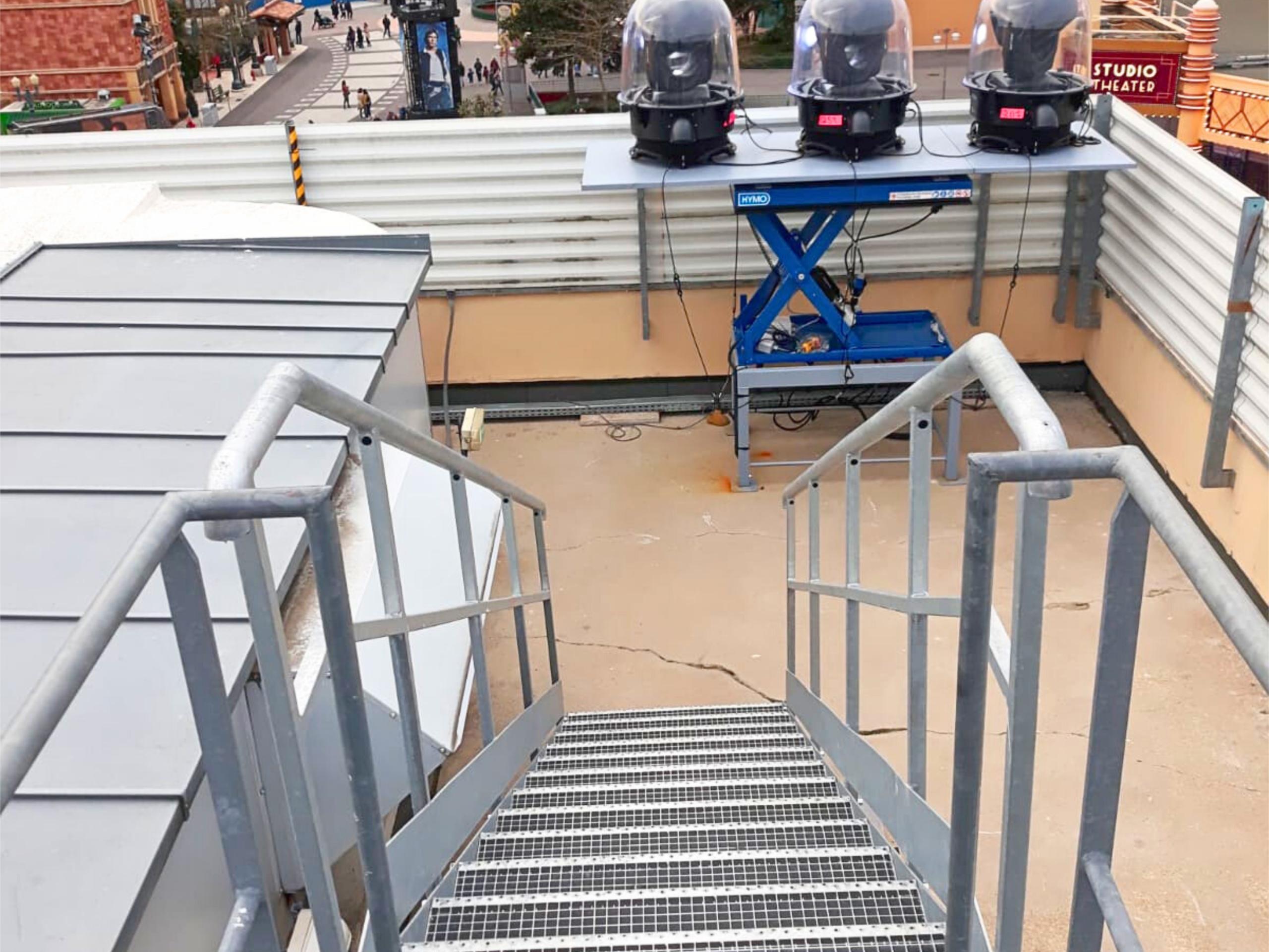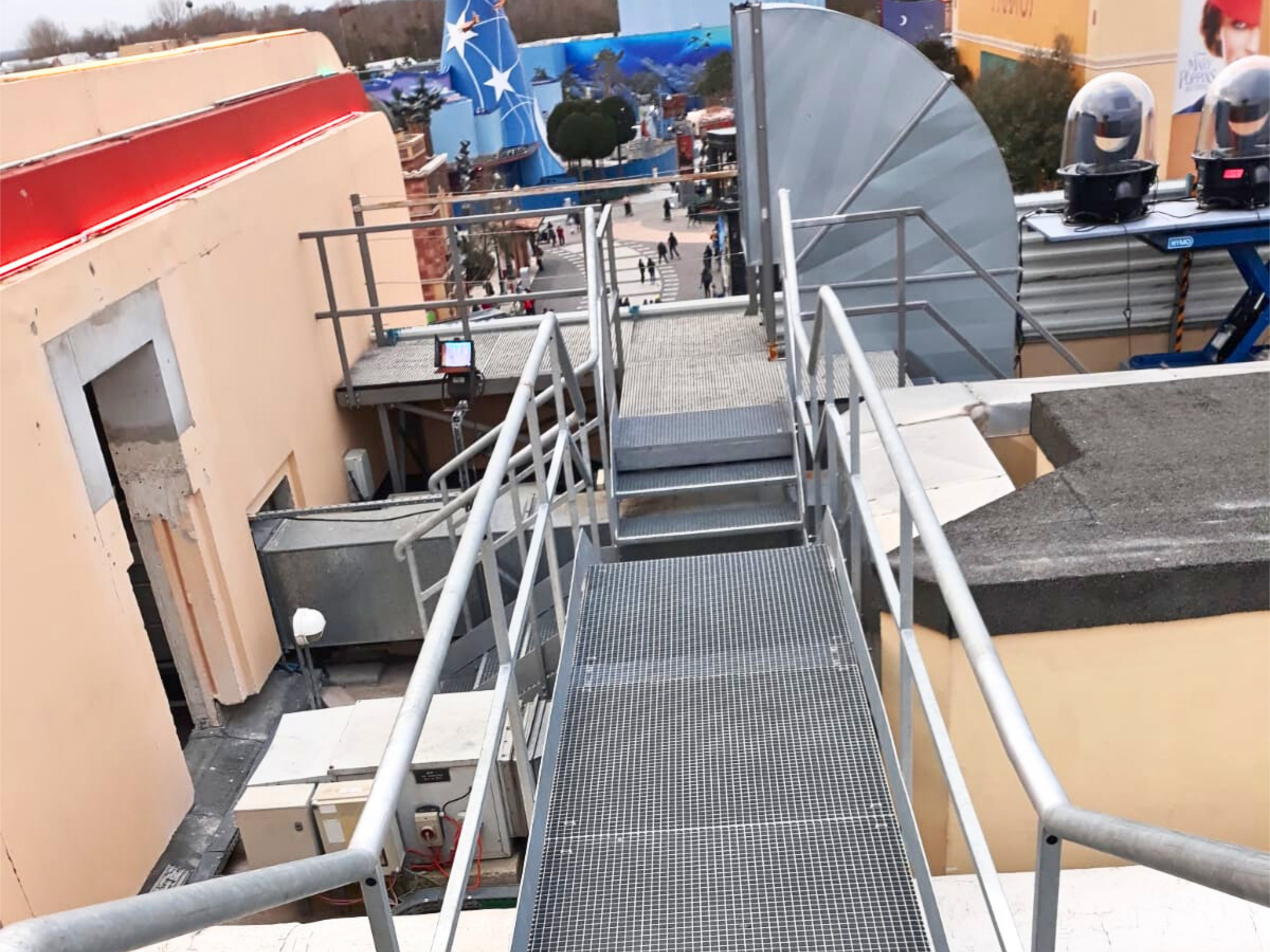 Nos équipes ont conçu et installé une plateforme métallique en toiture, destinée à accueillir des spectacles et animations scéniques. Pensée pour être à la fois discrète, robuste et sécurisée, elle garantit aux artistes et techniciens un espace d’intervention parfaitement stable.