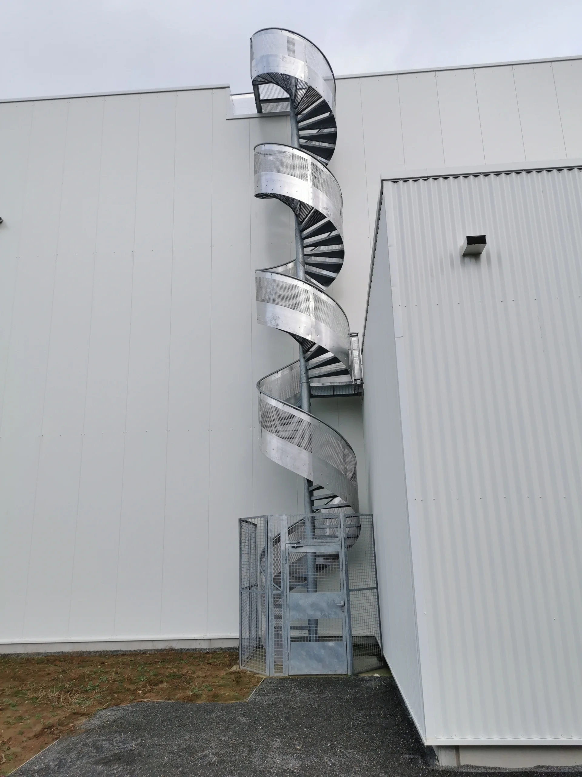 L’un des éléments phares de ce projet fut la réalisation d’un escalier hélicoïdal de 13 mètres de hauteur, comportant deux paliers intermédiaires. Modélisé en CAO 3D et conçu à partir d’une note de calcul rigoureuse, il a exigé une fabrication d’une grande précision en atelier, suivie d’un traitement de galvanisation à chaud et d’une installation millimétrée sur site à l’aide de grues de levage lourdes.