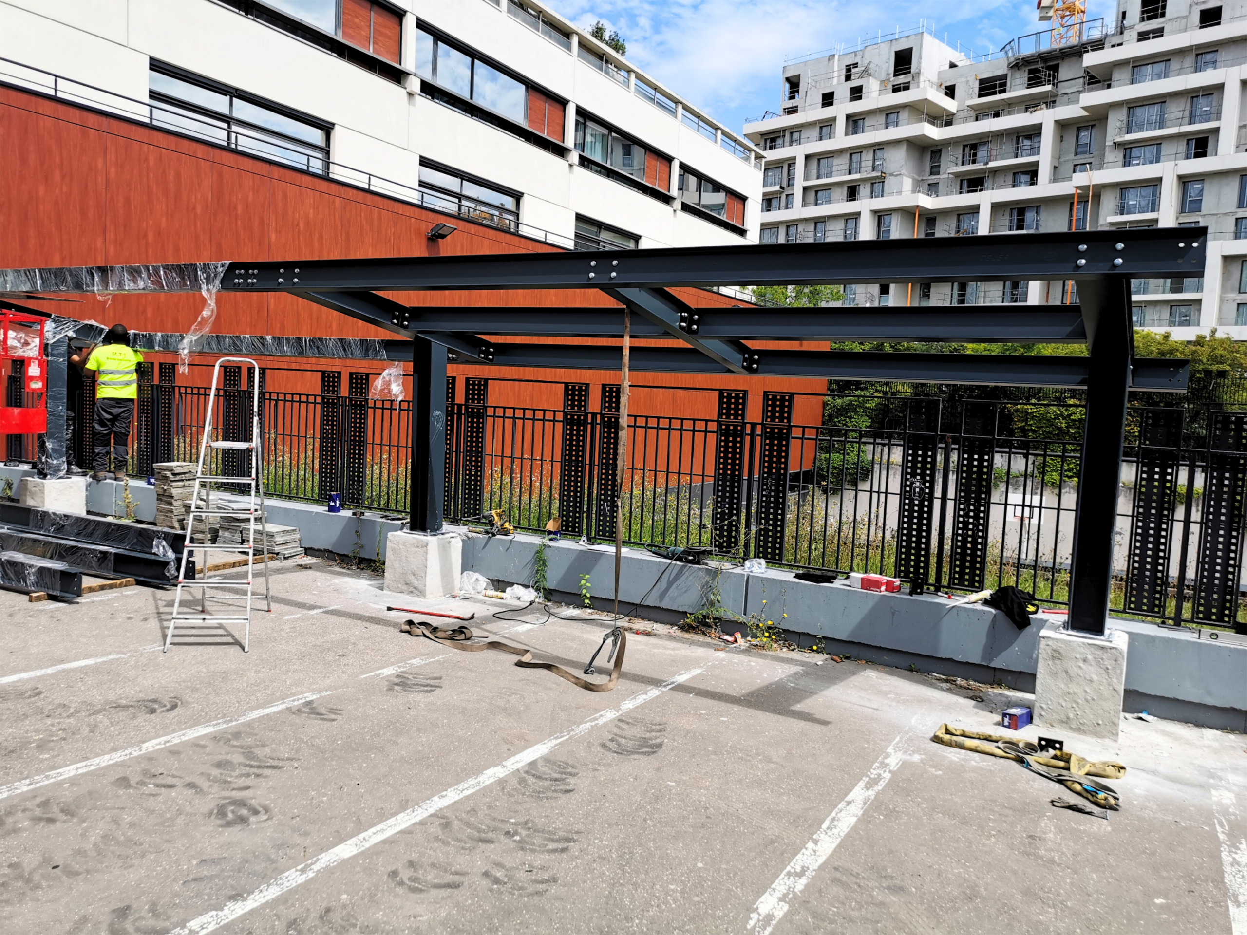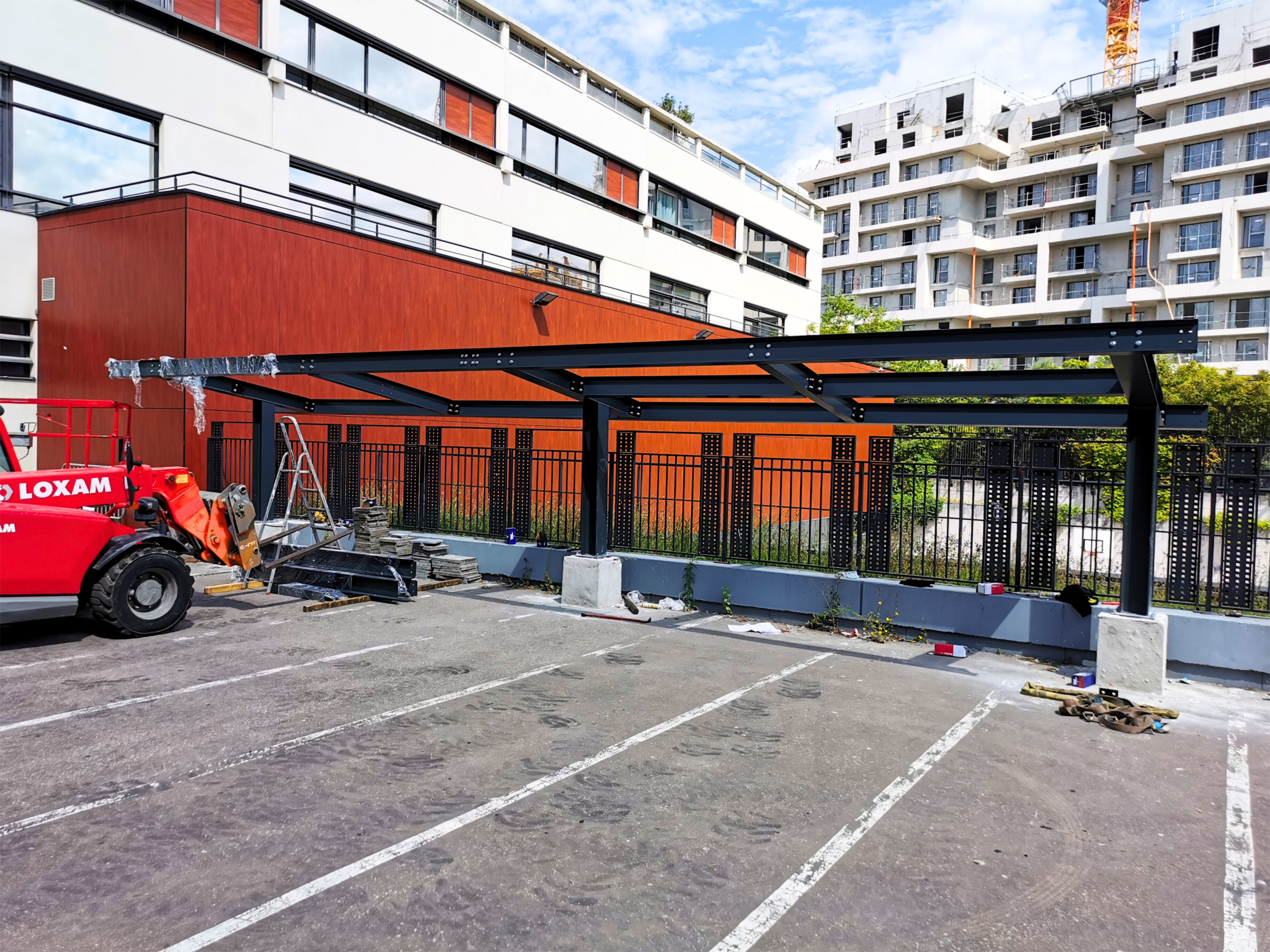 Nos équipes ont assuré les relevés sur site, la modélisation 3D et la note de calcul afin de garantir la conformité structurelle et la parfaite intégration du préau au bâti existant. Chaque élément a été fabriqué dans nos ateliers — découpe, soudure, traitement anticorrosion et peinture — puis soumis à un contrôle qualité rigoureux avant expédition.